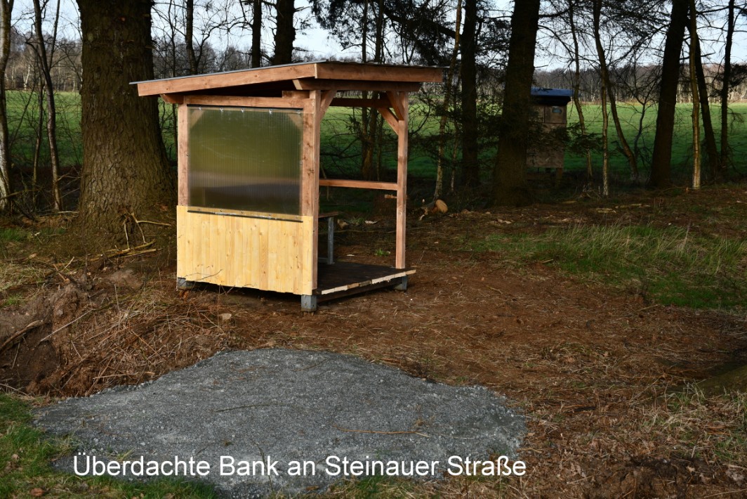 Pavillon, Hütten, Bänke und Tafeln gebaut oder aufgestellt. Die Bänke müssen renoviert oder restaureirt werden.